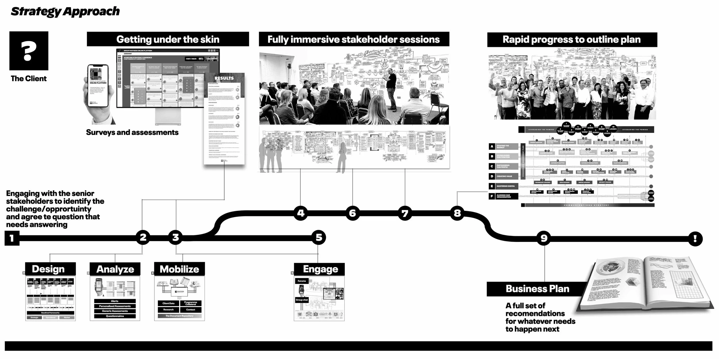 A fixed-fee programme covering all four phases. Led by John Caswell, Hazel Tiffany, supported by the team and GP studio. Includes all framework development, facilitation, visualisation, digital assets, narrative materials, and handover.