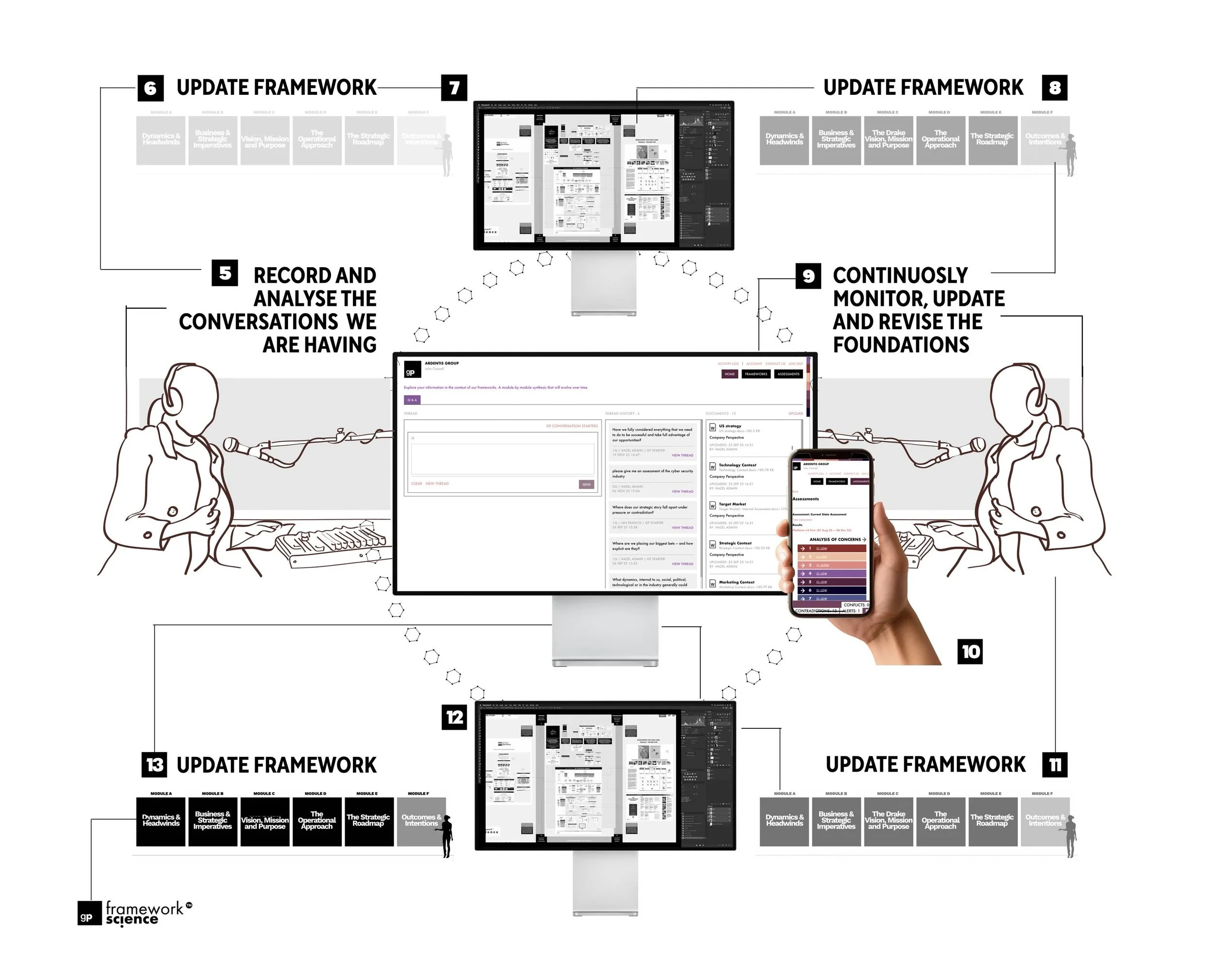 At agreed points, we regenerate the frameworks to see how the system is developing.
