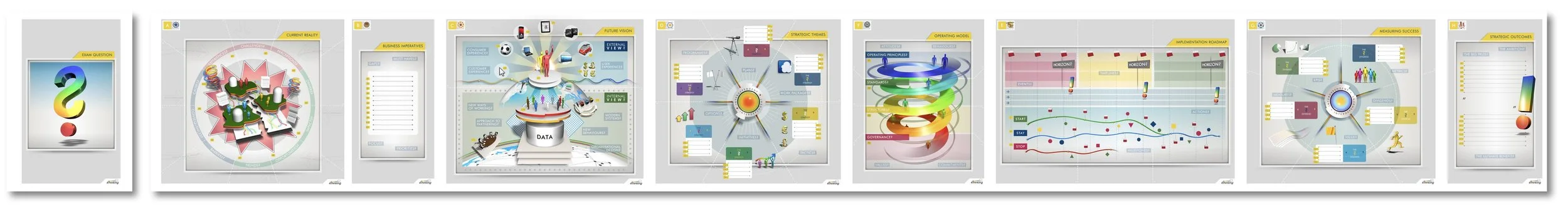 Structured Visual Thinking™ is a systematic method of organising and synthesising a topic. It transforms complex ideas through visual representations. These logic frameworks explain a given subject's story in discrete modules. Examples are shown here.