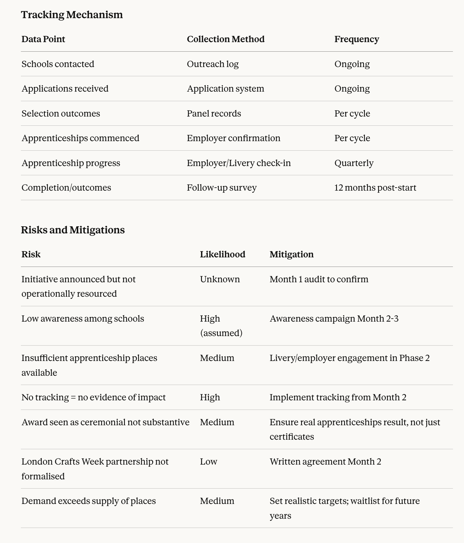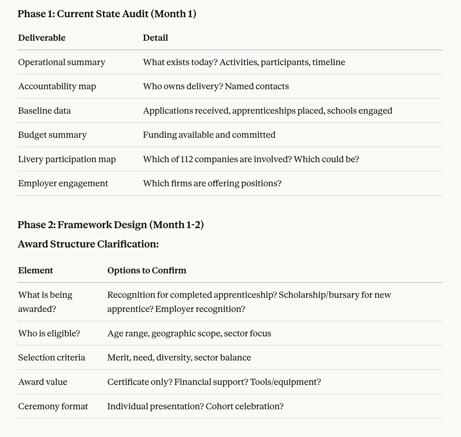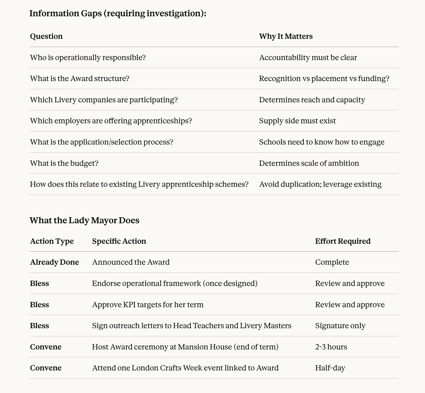 Mandate: Operationalise the Lady Mayor's Livery Craft Apprenticeship Award for measurable impact.