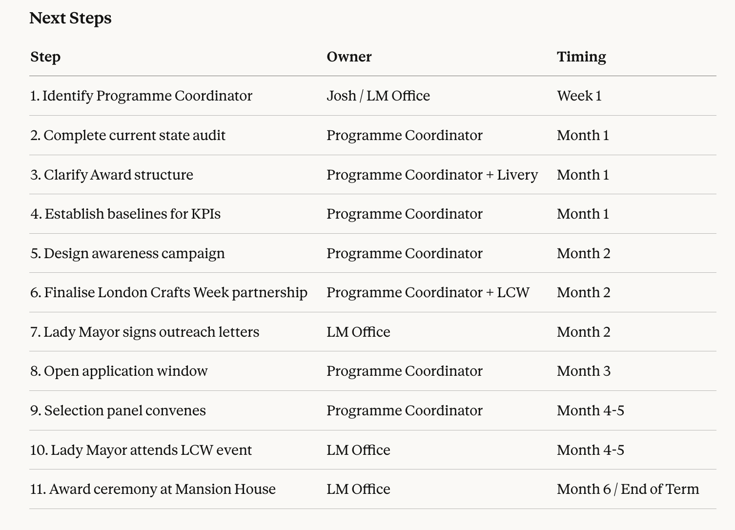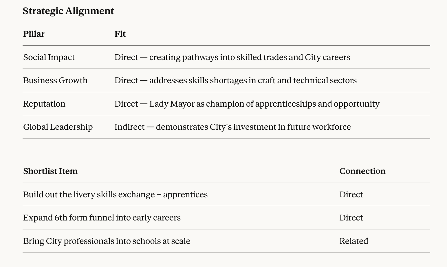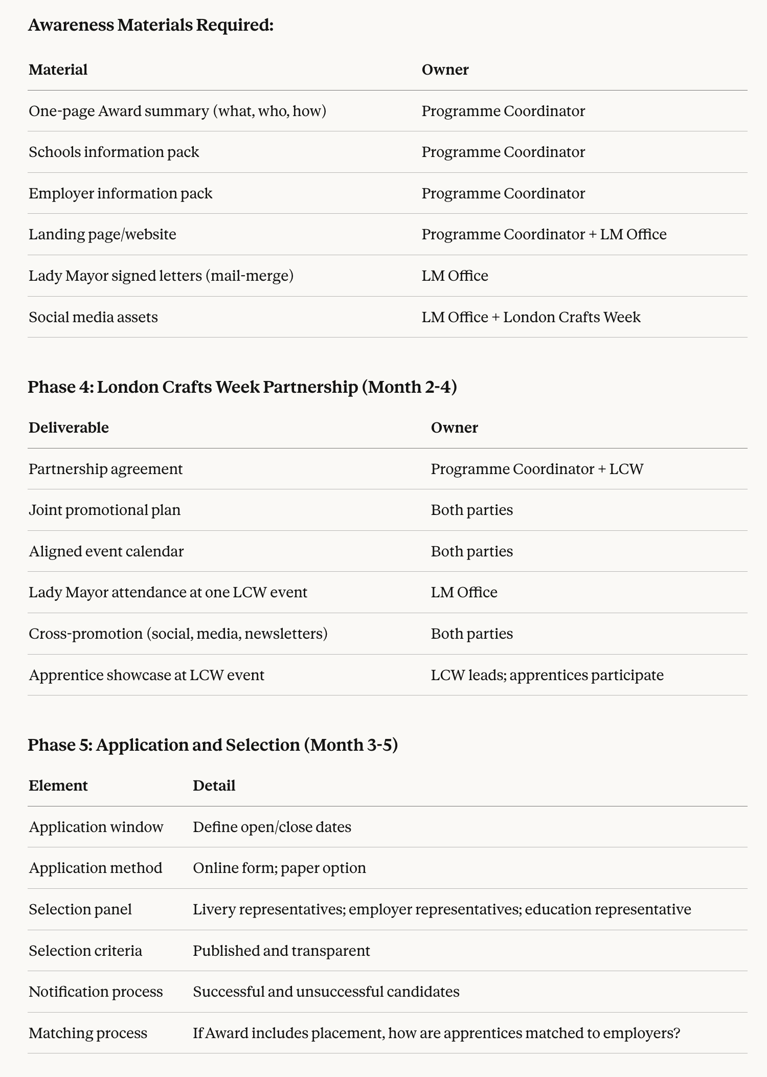 Mandate: Operationalise the Lady Mayor's Livery Craft Apprenticeship Award for measurable impact.