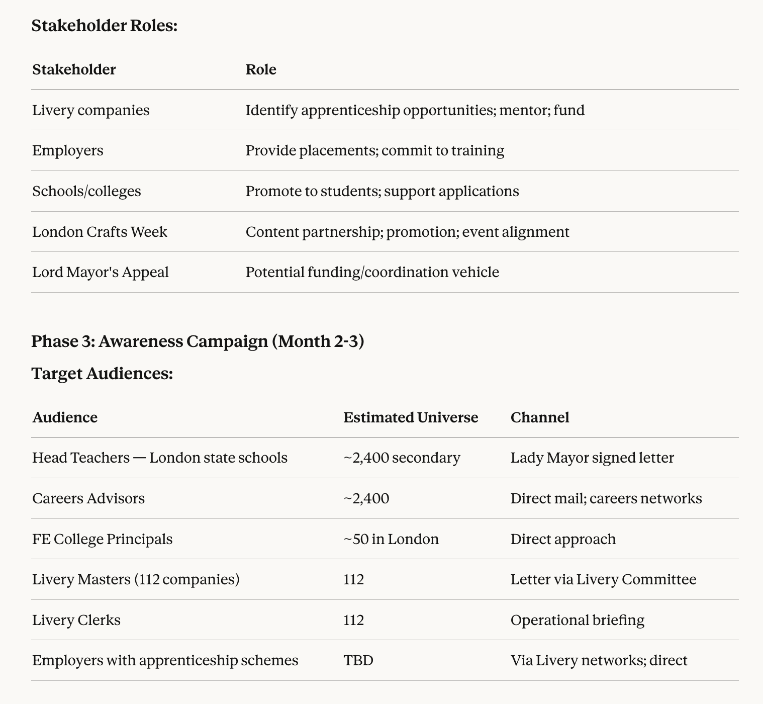 The partnership with London Crafts Week provides content and credibility; the Livery network provides placements and mentorship; the tracking mechanism provides evidence of impact. For UnSquaring the Square Mile, apprenticeships are the antithesis of the City's opaque, networked recruitment culture.